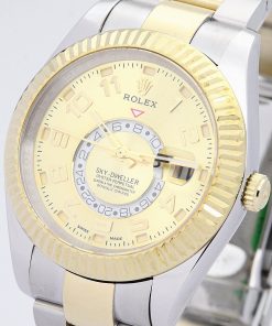 Featuring a striking 42mm yellow gold-plated case, this Sky-Dweller model exudes elegance and sophistication. The gold dial adds a touch of opulence, perfectly complementing the two-tone Oyster bracelet crafted from stainless steel and yellow gold plating. Its bold yet refined aesthetic ensures it makes a statement on any occasion.