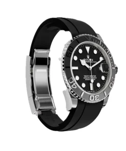 Designed for comfort and durability, the Yacht-Master features a high-quality rubber band that complements its sporty yet refined aesthetic. The scratch-resistant sapphire crystal protects the striking black dial, while the 30-meter water resistance makes it suitable for everyday wear and light water activities.