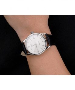 Featuring a refined 38mm polished stainless steel case, this watch strikes the perfect balance between understated luxury and modern proportions. The gleaming white dial provides a clean, sophisticated backdrop for the elegant hour markers and hands, while the scratch-resistant sapphire crystal offers superior clarity and protection. The genuine black crocodile leather band adds a touch of refined comfort, making it ideal for both formal occasions and everyday wear.