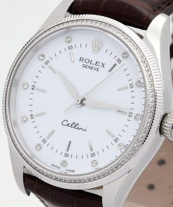 The Rolex Cellini 25mm White Dial 5310-2 is a timeless women’s watch that blends elegance with precision. Designed for sophistication, this timepiece features a sleek 25mm white gold-plated case, exuding understated luxury. The pristine white dial offers a clean, minimalist aesthetic, perfectly complemented by the rich brown crocodile leather band for a classic yet contemporary look.
