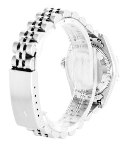 Featuring a pristine white dial, this Datejust model exudes classic Rolex styling with exceptional clarity. The automatic Miyota movement ensures reliable timekeeping, while the scratch-resistant sapphire crystal protects the dial from everyday wear. The stainless steel bracelet complements the case beautifully, creating a seamless and comfortable fit on the wrist.