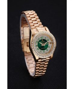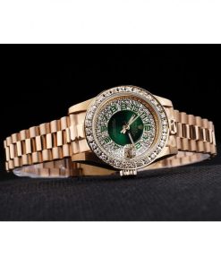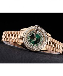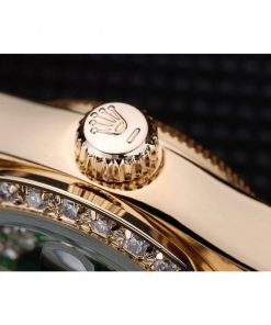 The Rolex Datejust 28mm Green Dial RL39 is a stunning women’s watch that combines timeless elegance with modern craftsmanship. Designed for those who appreciate luxury, this timepiece features a vibrant green dial that exudes sophistication, perfectly complemented by its yellow gold-plated case and band. The 28mm case size offers a delicate yet bold presence on the wrist, making it ideal for both everyday wear and special occasions.
