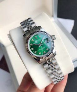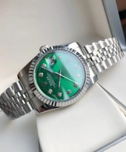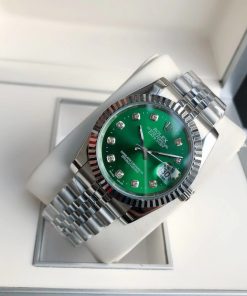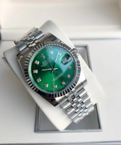 The Rolex Datejust 36/28mm SS/SS Jub Green/Dia is a stunning timepiece that masterfully blends classic elegance with modern precision. Crafted from solid 316L stainless steel, this watch exudes durability and sophistication, making it a perfect accessory for both casual and formal occasions. Its green dial, adorned with dazzling diamond markers, adds a touch of luxury and uniqueness, ensuring you stand out with every glance at your wrist.