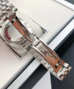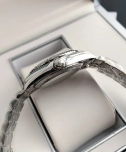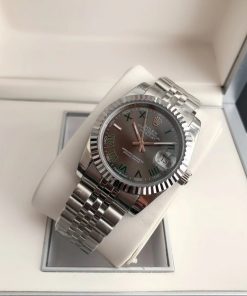 Featuring a sleek grey dial with Roman numeral markers, the watch exudes classic refinement. The scratch-proof sapphire crystal ensures durability, while the fluted bezel adds a touch of iconic Rolex design. Whether you choose the 36mm or 28mm case, both are constructed from solid 316L stainless steel, offering resilience and a polished finish.