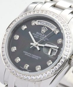 The Rolex Day-Date 36mm Black Dial 118346 is a masterpiece of horological craftsmanship, blending timeless elegance with precision engineering. This men’s watch features a striking 36mm steel case exquisitely set with diamonds, offering a luxurious touch that commands attention. The iconic President bracelet, crafted from 316-grade stainless steel, ensures both durability and comfort for everyday wear.