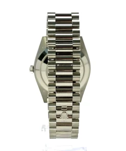 Featuring a sleek 40mm white gold-plated case and matching President bracelet, this timepiece exudes sophistication. The striking black dial offers perfect contrast against the polished finish, while the sapphire crystal ensures scratch-resistant clarity. Powered by a reliable kinetic (automatic) movement with Swiss ETA quality, it delivers exceptional accuracy and performance.