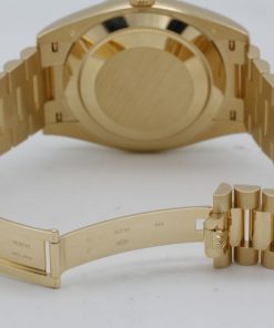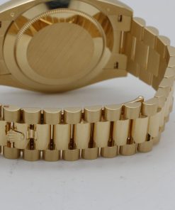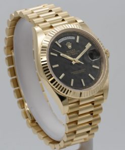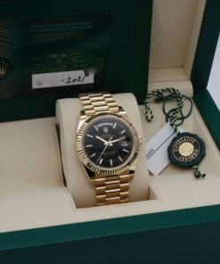 The Superclone Rolex Day-Date 40 mm Black Dial 228238 is a masterpiece of precision engineering, designed to capture the essence of luxury with its impeccable craftsmanship. This men’s watch features a striking 18k yellow gold case and fluted bezel, exuding timeless elegance. The 40 mm diameter makes a bold statement on the wrist, while the black dial adds a sophisticated contrast to the rich gold tones.