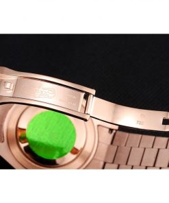 The scratch-resistant sapphire crystal ensures durability while maintaining crystal-clear visibility of the dial. With water resistance up to 30 meters, this Superclone watch is designed for everyday wear without compromising on its refined appearance. Every element, from the rose gold plating to the precise day-date function, reflects the superior craftsmanship that goes into creating this remarkable replica.