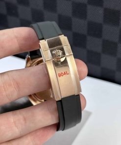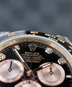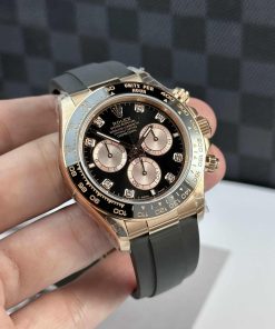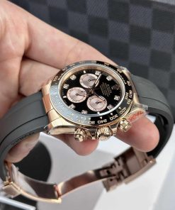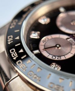The Sundust dial, set with diamonds, exudes sophistication, complemented by the 18k Everose gold case and black Cerachrom bezel. The Oysterflex band adds comfort and style, making this watch as practical as it is luxurious. With a 40 mm case diameter and sapphire crystal, the Daytona 126515LN replica is designed to impress at every glance.