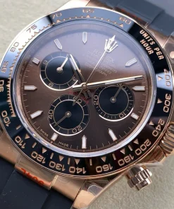 Featuring a stunning 18k Everose gold case and an Oysterflex band, this Daytona exudes elegance and durability. The 40 mm case diameter ensures a perfect balance of presence and comfort on the wrist, while the sapphire crystal provides scratch-resistant clarity for the bright chocolate and black dial.