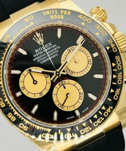 The Superclone Rolex Daytona 40mm with Intense Black Dial (Reference 126518LN) represents the pinnacle of replica watch craftsmanship, offering an exceptional alternative to the genuine Rolex at a fraction of the price. This meticulously crafted timepiece captures every detail of the original, from its 18k yellow gold case to the striking black monobloc Cerachrom bezel. The 40mm case houses an intense black dial that exudes sophistication, perfectly complemented by the durable Oysterflex band for both style and comfort.