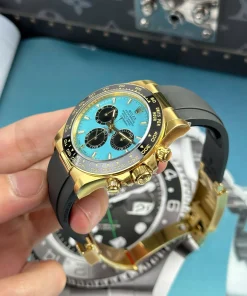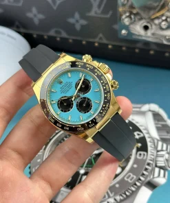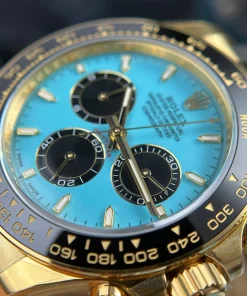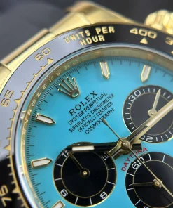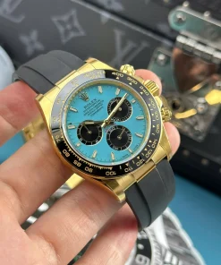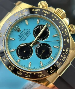 Featuring a stunning 18k yellow gold case and the distinctive Oysterflex band, this Superclone Daytona combines elegance with durability. The eye-catching turquoise blue and black Tiffany dial adds a touch of sophistication, while the sapphire crystal ensures scratch-resistant clarity for years to come.