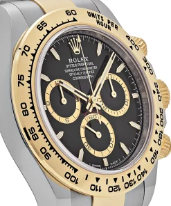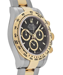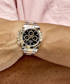 The Daytona’s striking design features a bright black dial paired with an 18k yellow gold bezel, exuding luxury and sporty elegance. The Oyster bracelet, crafted from Oystersteel and 18k yellow gold, offers both comfort and resilience, while the sapphire crystal ensures scratch-resistant clarity. Waterproof up to 50 meters, the Superclone is built for everyday wear, though its AAA counterpart remains suitable for showers and swimming. Both models maintain the Daytona’s signature 40mm case diameter, ensuring a classic wrist presence.
