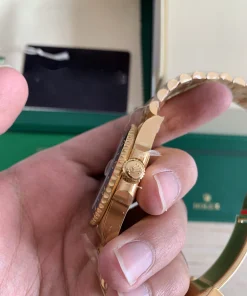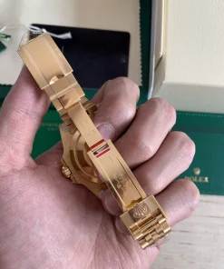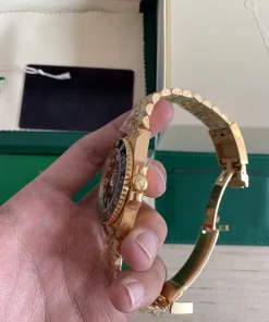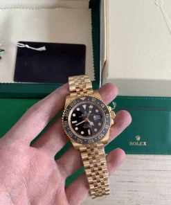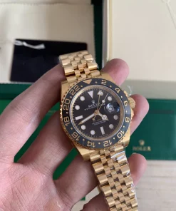 Designed for the modern globetrotter, this GMT-Master II replica offers water resistance up to 30 meters, making it suitable for everyday use. The ceramic bezel material ensures durability against scratches and fading, while the molded numerals and graduations maintain their crisp appearance over time. Every detail, from the polished gold surfaces to the functional GMT complication, has been faithfully reproduced to create a timepiece that captures the essence of Rolex craftsmanship.