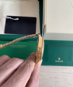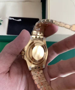 Precision meets elegance with the Swiss ETA automatic movement, delivering reliable timekeeping that rivals authentic Rolex watches. The scratch-resistant sapphire crystal protects the dial while maintaining crystal-clear visibility from every angle. The iconic Jubilee bracelet, featuring five-piece links in matching 18k yellow gold, provides exceptional comfort and a secure fit for daily wear.
