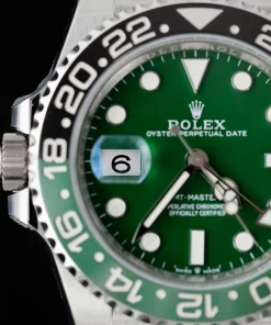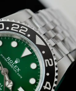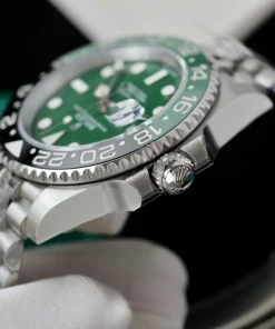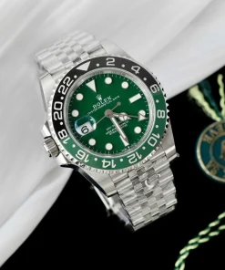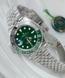 At the heart of this timepiece lies a high-performance kinetic (automatic) movement, ensuring reliable accuracy with every wear. The vibrant green ceramic dial, nicknamed “Absinthe” for its mesmerizing hue, is protected by a scratch-resistant sapphire crystal, offering durability and clarity. Designed for versatility, the GMT-Master II functionality allows seamless tracking of multiple time zones, making it ideal for globetrotters and watch enthusiasts alike.