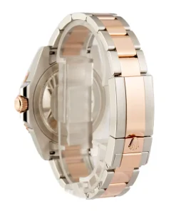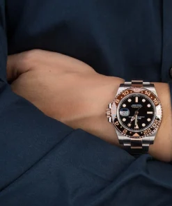 What truly sets this GMT-Master apart is its distinctive “Root Beer” aesthetic, combining warm rose gold tones with classic stainless steel for a look that’s both luxurious and understated. The black dial serves as an elegant backdrop for the watch’s functionality, including its GMT complication that allows tracking of multiple time zones simultaneously.
