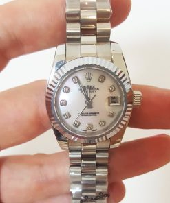 The Rolex Datejust 26mm Mother of Pearl Dial 179179 is a stunning women’s watch that combines timeless elegance with precision engineering. Designed for those who appreciate luxury and sophistication, this timepiece features a radiant mother-of-pearl dial that catches the light beautifully, creating a mesmerizing effect. The 26mm case diameter makes it perfectly proportioned for a feminine wrist, while the 316-grade stainless steel construction ensures durability and a polished finish.