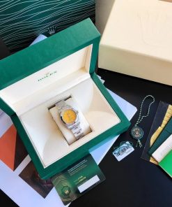 Perfect for both casual and formal occasions, the Rolex Oyster Perpetual features a comfortable deployant buckle clasp for secure wear. The waterproof design (up to 30m) adds practicality to its elegant aesthetics. Whether you choose the 31mm or 41mm case size, this watch makes a statement with its bold yellow dial and classic Rolex styling.