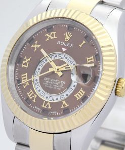 Featuring a sophisticated 42mm yellow gold-plated case and a striking brown dial, this Sky-Dweller model exudes luxury and refinement. The combination of stainless steel and yellow gold-plated Oyster bracelet offers both durability and elegance, ensuring comfort and prestige on the wrist.