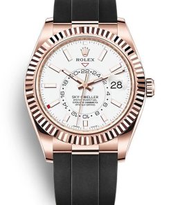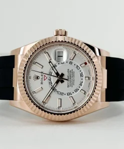 The Rolex Sky-Dweller 42mm White Dial 326235 is a masterpiece of horological engineering, blending sophisticated design with exceptional functionality. This men’s watch features a striking 42mm rose gold-plated case that exudes luxury, paired with a comfortable rubber band for everyday wearability. The pristine white dial offers perfect contrast against the warm tones of the case, creating a timeless aesthetic that commands attention.