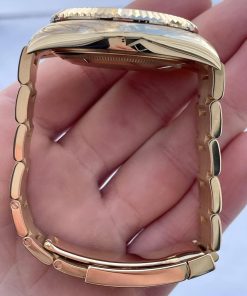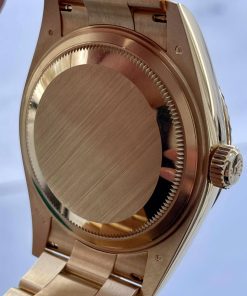 At the heart of this timepiece lies a kinetic (automatic) movement, renowned for its reliability and Swiss (ETA) quality. The intense white dial provides a striking contrast against the rich yellow gold, enhancing readability and adding a touch of modern refinement. The Oyster three-piece solid links band ensures both comfort and durability, making it ideal for everyday wear or special occasions.