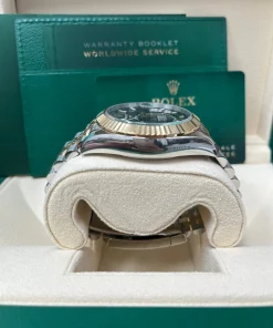 The Superclone Rolex Sky-Dweller 42 mm with a bright black dial (Reference 336933) is a masterpiece of precision engineering and luxury design. This men’s watch combines the iconic aesthetics of Rolex with exceptional craftsmanship, making it a standout timepiece for discerning collectors. Its 42 mm case, crafted from Oystersteel and 18k yellow gold, offers a perfect balance of durability and elegance, while the fluted bidirectional rotatable Rolex Ring Command bezel adds a touch of sophistication.