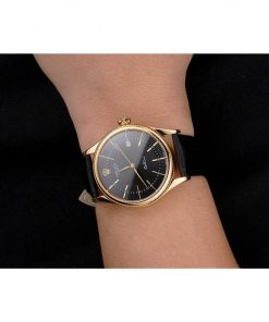 Encased in luxurious yellow gold plating, the 38mm diameter case exudes understated luxury, while the sleek black dial adds a touch of modern refinement. The genuine crocodile leather band in black complements the dial perfectly, offering both comfort and durability for everyday wear. Protected by scratch-resistant sapphire crystal, the watch maintains its pristine appearance even with regular use.