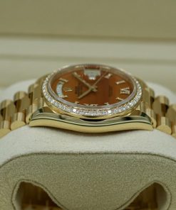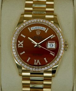 Featuring an 18k yellow gold case and a dazzling diamond-set bezel, this watch exudes sophistication. The 36 mm case diameter offers a classic yet versatile fit, while the President bracelet with semi-circular three-piece links ensures comfort and style. The Carnelian dial, adorned with diamonds, adds a touch of vibrant elegance, perfectly complementing the gold finish.