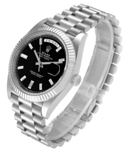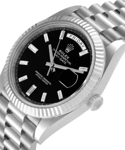 The Day-Date’s legendary status as the ultimate prestige watch makes this 40mm model an excellent choice for discerning collectors. Its combination of the iconic President bracelet, automatic movement, and striking black baguette dial creates a timepiece that commands attention while maintaining the understated elegance Rolex is known for.