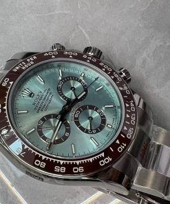 The watch’s striking ice blue dial perfectly complements the platinum case and chestnut brown ceramic bezel, creating a sophisticated color combination that exudes luxury. The open caseback offers a fascinating view of the intricate movement, a feature that watch enthusiasts will particularly appreciate. With a 40mm case diameter and oyster bracelet featuring three-piece solid links, this Daytona maintains the perfect balance of presence and comfort on the wrist.